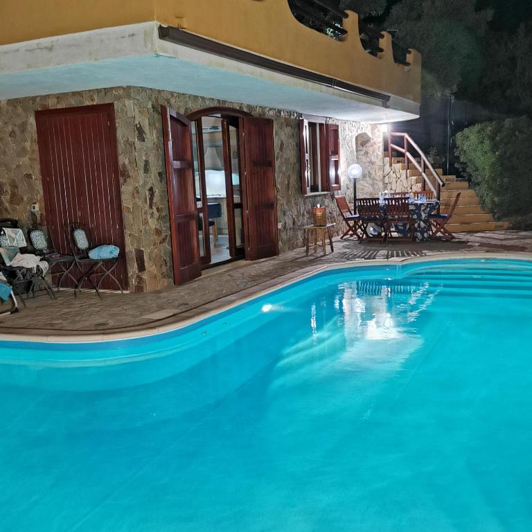 Die Unterkunft VILLA VITTORIA with PRIVATE HEATED SWIMMING POOL COMPLETE WITH HIDROMASSAGE FOR EXCLUSIVE USE, SEA and BEACH VIEW, 150 METERS FROM THE BEACH, POOL 60 m2 dept 140 cm, die über einen saisonalen Außenpool, einen Garten und eine Terrasse verfügt, bietet Übernachtungsmöglichkeiten in Torre delle Stelle mit kostenlosem WLAN und Meerblick.