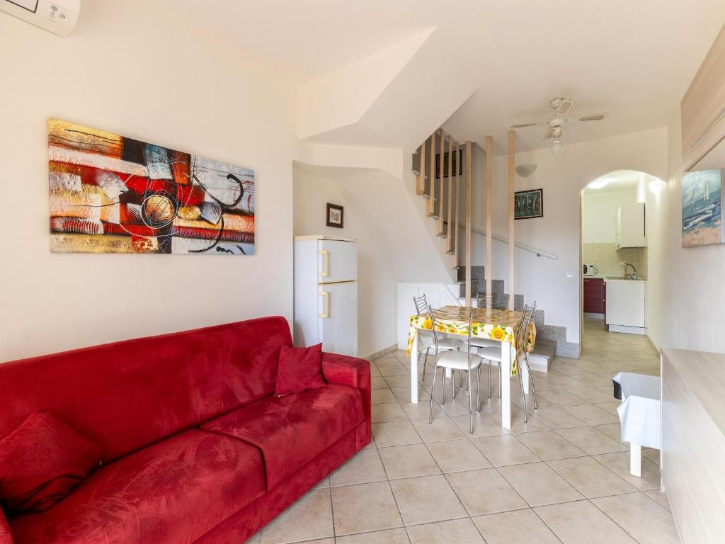The Air-conditioned apartment with sea view in Castelsardo offers a spacious layout with two bedrooms and two bathrooms. The living room features a sofa and a balcony with garden views.Modern Amenities